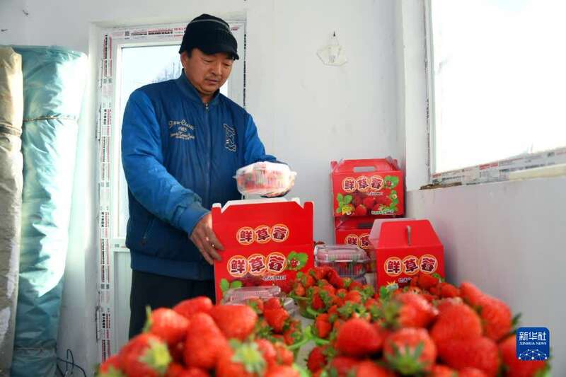 1月2日,在北京市平谷区马坊镇二条街村草莓种植园区,果农将采摘的草莓装盒。