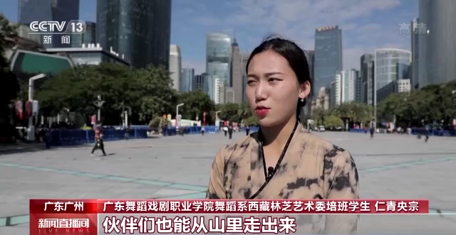 广东舞蹈戏剧职业学院舞蹈系西藏林芝艺术委培班学生 仁青央宗:现在大家都富有起来了,房子也盖起来了,路也通了,伙伴们也能从山里走出来。感谢祖国给我们那么好的条件,希望各个民族越来越团结,大家生活越来越好。