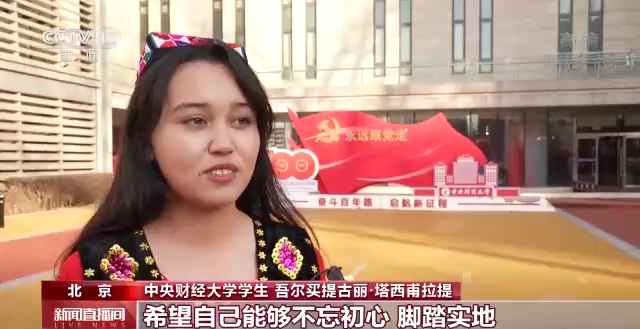 中央财经大学学生 吾尔买提古丽·塔西甫拉提:我今年(2021年)最激动的事情就是成为了一名光荣的预备党员。希望自己能够不忘初心,脚踏实地,做好每一件事情,也希望作为少数民族能为自己地区发展贡献一份自己的力量。