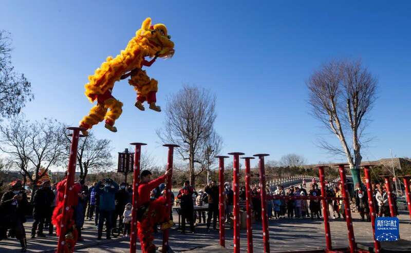 1月2日,游客在山东省烟台市蓬莱阁风景区观看舞狮表演。