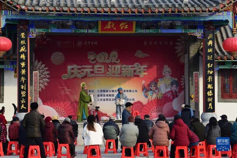 1月2日,市民在江苏省淮安市金湖县尧帝古城庙会广场观看淮剧。