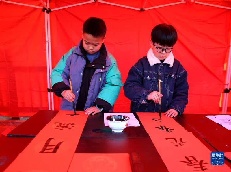 1月1日,小朋友在江苏省淮安市洪泽湖古堰景区写对联。