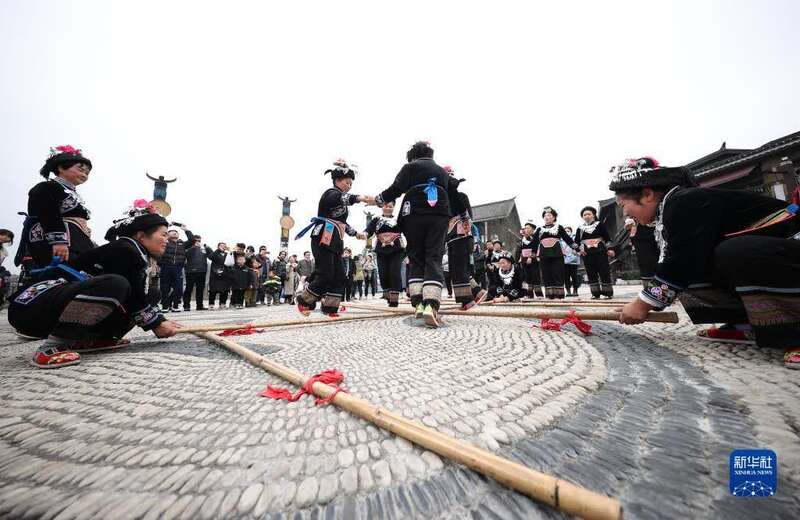 1月2日,游客在贵州省丹寨县万达小镇景区观看竹竿舞表演。