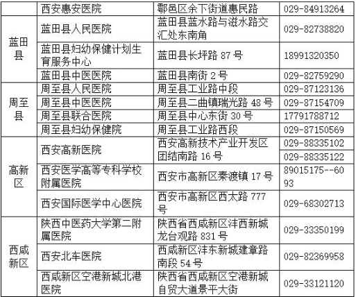 阎良区:阎良区人民医院,24小时预约联系电话86875200,地址:阎良区胜利街康复巷9号。西安交通大学第一附属医院东院区,24小时预约联系电话86848133,地址:阎良区前进西路与迎宾北路十字东南。