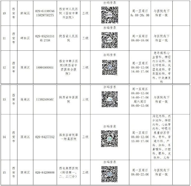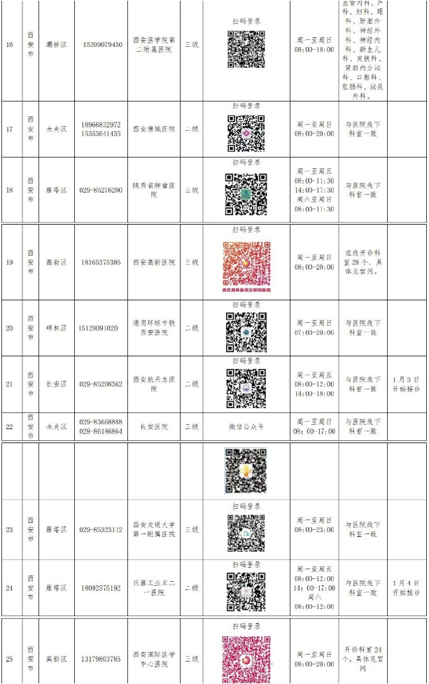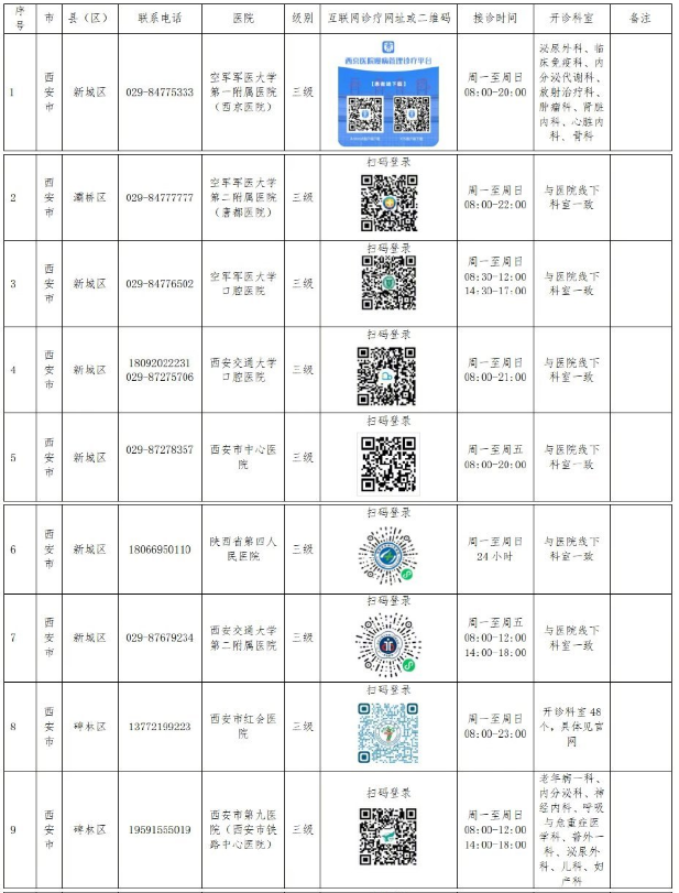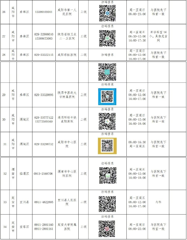 西安、咸阳、渭南、延安34家医院已上线互联网诊疗服务,广大患者可通过扫码登录访问医院的互联网诊疗平台即可获得问诊、复诊等线上医疗服务。名单如下: