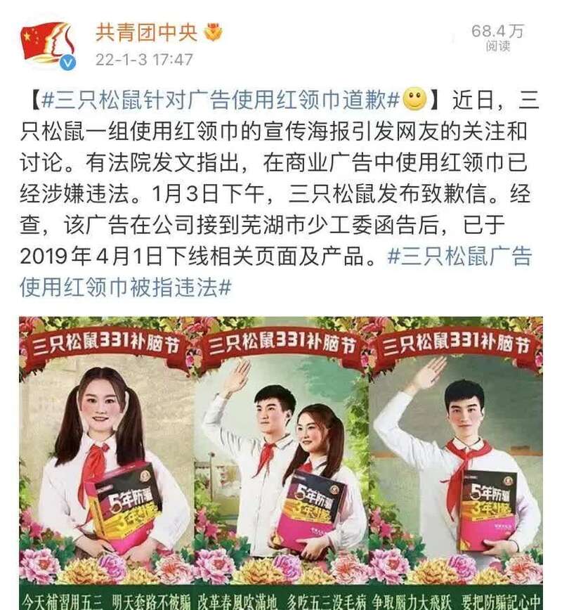 近日,三只松鼠一组使用红领巾的宣传海报引发关注。有法院发文指出,在商业广告中使用红领巾已经涉嫌违法。1月3日下午,三只松鼠发布致歉信。经查,该广告在公司接到芜湖市少工委函告后,已于2019年4月1日下线相关页面及产品。