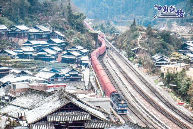 货运列车穿行在雪后的广西三江侗族自治县侗寨间。陈泉任 摄