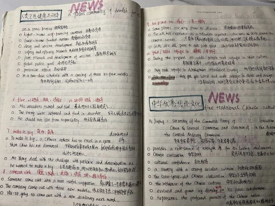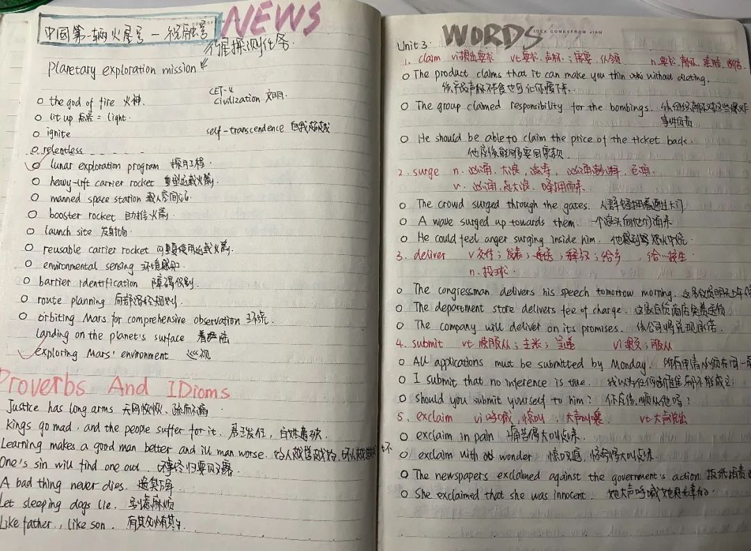 上课时老师讲课速度比较快,可先在课本上直接做笔记、划单词写在课本上,这样不会忘记知识点,也可以很好地和书上知识点融合。在课后将重点单词以及知识点抄录在笔记本上。