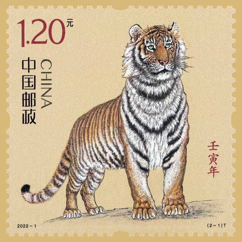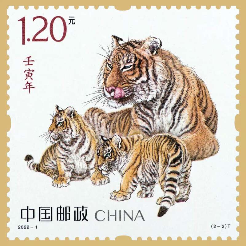 《壬寅年》特种邮票由画家冯大中创作,邮票1套2枚,全套邮票面值2.40元。延续了第四轮生肖邮票的设计理念,诠释“国”与“家”的概念。第一枚邮票名为“国运昌隆”,描绘了一只气宇轩昂的上山虎形象,矗立远眺、志存高远,传达出国家蒸蒸日上、雄心壮志的含义;第二枚邮票名为“虎蕴吉祥”,描绘了面容温婉的虎妈妈带着两只小虎的温馨场景,寓意儿孙兴旺、家庭美满。
