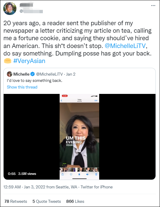 一名亚裔记者兼作家也表达了对李的支持,并讲述了她自己的类似经历:“20年前,一位读者给我的报纸出版商写了一封信,批评我关于茶的文章,叫我‘幸运饼干’,还说他们应该雇一个美国人。 这类事真是没完没了。@MichelleLi,说点什么吧。饺子队支持你。#VeryAsian”