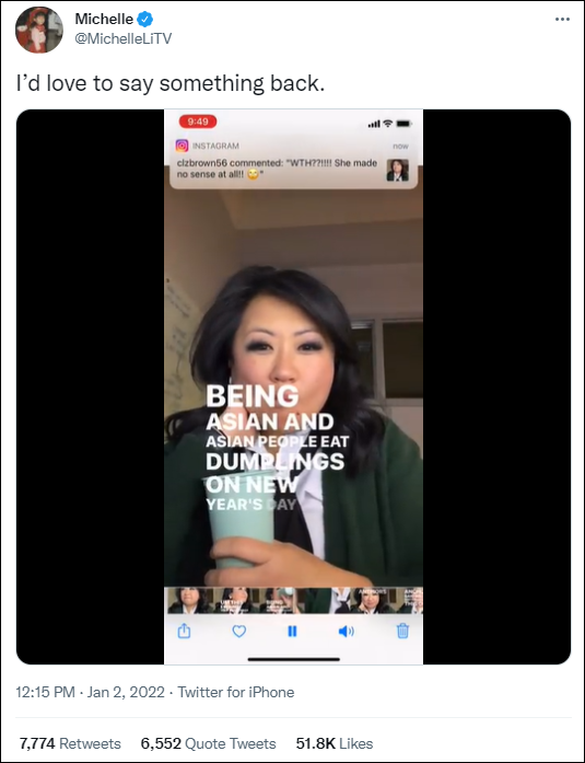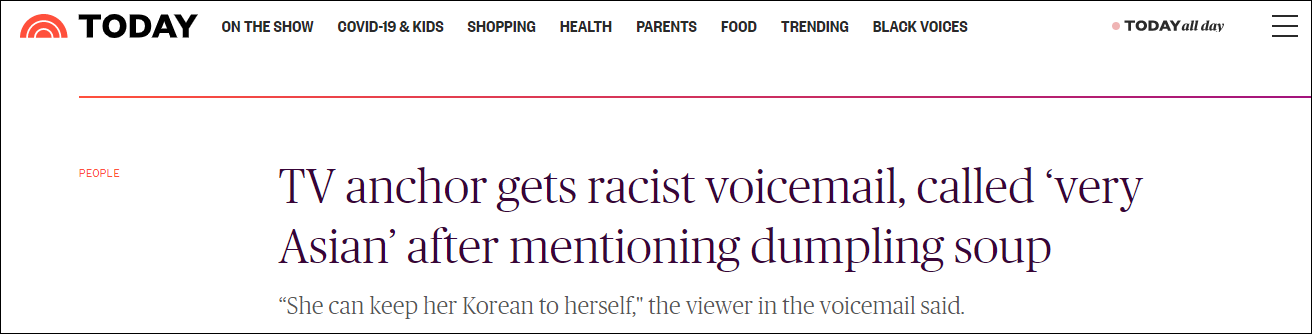 据报道,在这段节目播出后不久,一名观众打电话过来称:“嗨,今晚你们的亚洲主播提到了亚洲人和亚洲人在新年吃饺子的事情。嗯,我有点生气,因为(这就像)假使你的一个白人主播说‘白人会在新年吃这个’。”