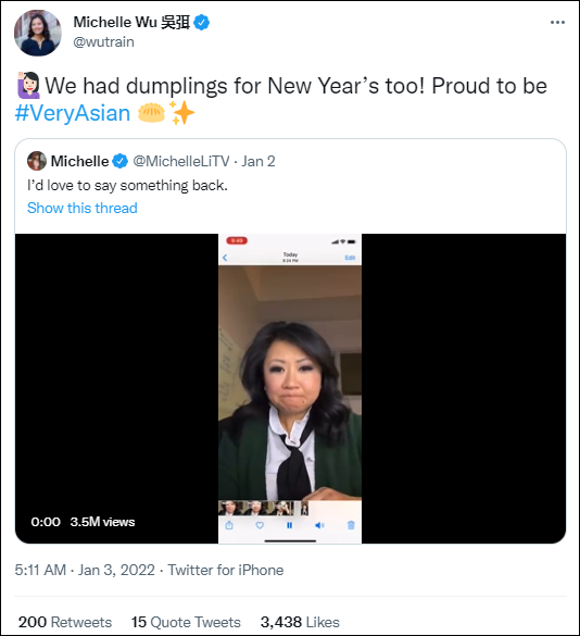 另外,波士顿华裔市长吴弭(Michelle Wu)也转发了李的推文,写道:“我们新年也吃饺子!很自豪能成为#VeryAsian。”