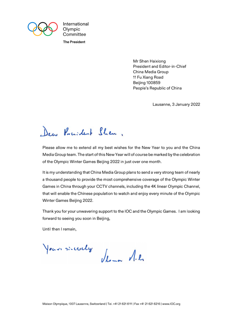 国际奥委会主席巴赫特致贺信表示,2022年新年开端的这次庆祝活动标志着北京冬奥会即将在一个月后到来。欣闻中央广播电视总台计划派出精兵强将对北京冬奥会进行最大规模的全方位转播报道,这支报道团队将通过总台各个平台,包括4K奥林匹克电视频道全面呈现冬奥会,中国观众将能够观看和欣赏到2022年北京冬奥会的每一个精彩瞬间。