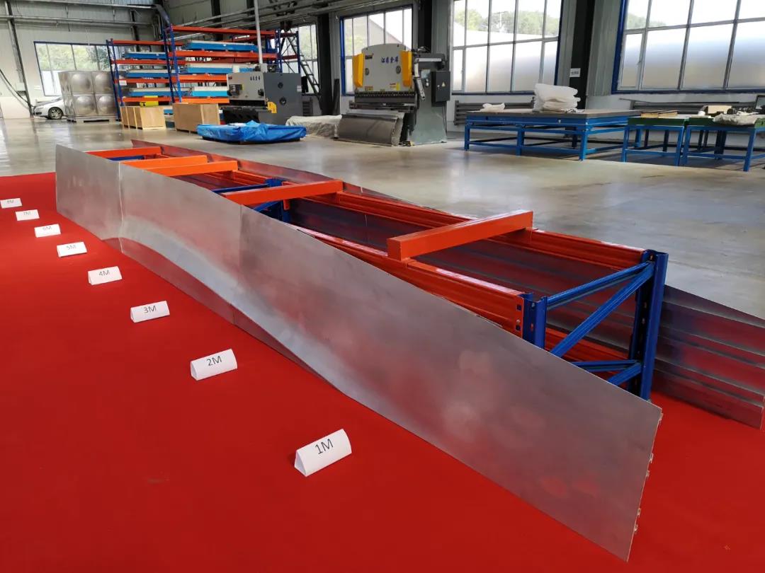 “瑞雪迎春”整车车头的成形难点在于连接板蒙皮与下墙板蒙皮。连接板蒙皮全长11米,由复杂曲面空间形状双棱线组成;下墙板蒙皮全长11米,产品形状均由曲率变化较大的型面构成,棱线圆角明显,坯料不是简单的板材,而是带有多条T型加强筋的开式型材,成形后不仅要保证外表面形状精度,还要保证每条T型加强筋的位置精度,成形难度极大。