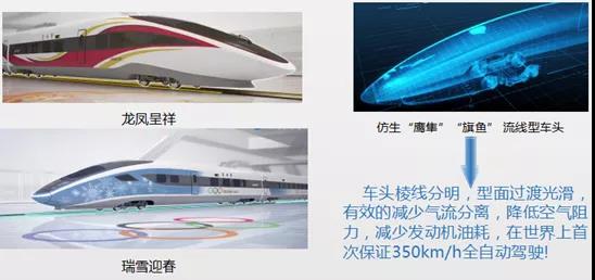 “龙凤呈祥”和“瑞雪迎春”采用仿生学与空气动力学原理,分别仿生于“鹰隼”与“旗鱼”。其流线型的仿生车头模型能够有效减少气体分流,降低空气阻力,减少内耗,保证时速。与此同时,这也增加了车头蒙皮的制造生产难度。