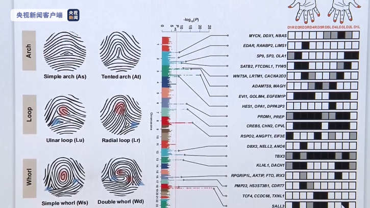 科院上海营养与健康研究所研究员 汪思佳:比如说手指的长度,我们发现斗型花纹越多的人,他的小指就越长,这个就非常有意思。这项研究最有突破性的就是,以前从来没有发现过指纹花纹差异背后到底是什么基因造成的,我们是第一次发现指纹的差异背后是肢体发育相关基因造成的。