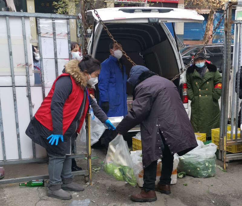 在社区上门供应蔬菜点,李喆(左一)正在帮助居民有序购买蔬菜。受访者供图