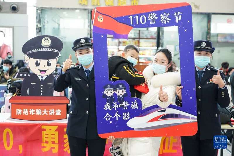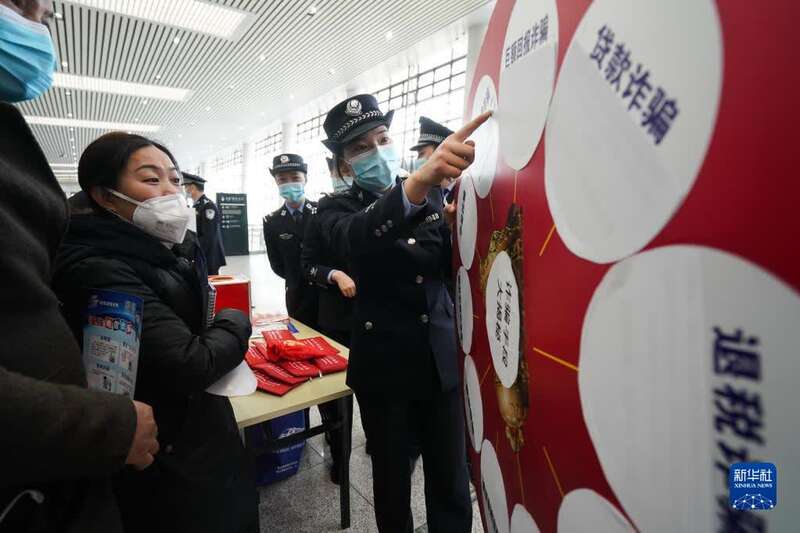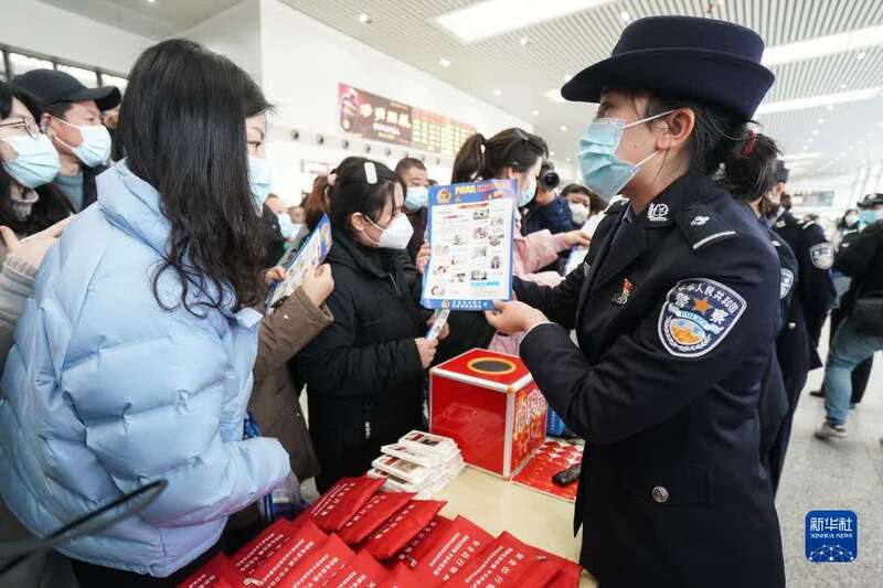 1月7日,民警在南京火车站候车大厅进行反诈宣传。