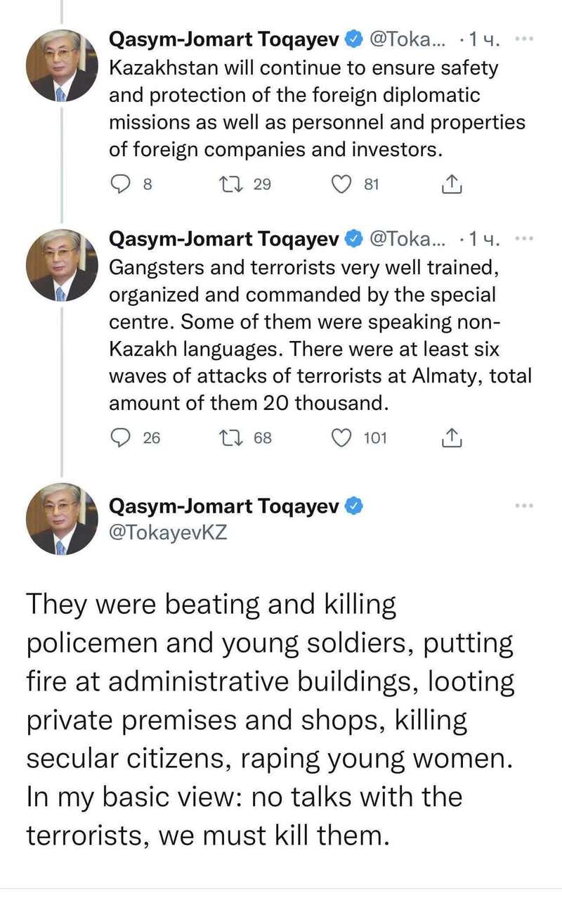 托卡耶夫还表示,袭击阿拉木图的暴徒和恐怖分子接受了良好的训练,组织严谨,受特别中心的指挥。他们中的有些人讲的不是哈萨克语。两万名左右的恐怖分子一共对阿拉木图发起了至少六波进攻。