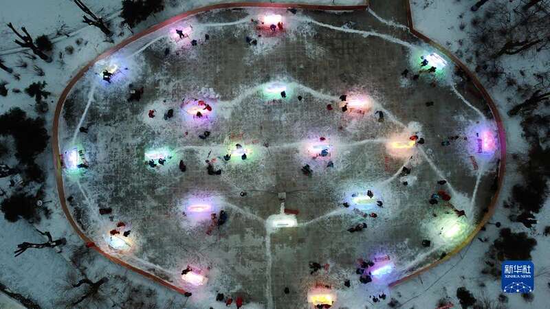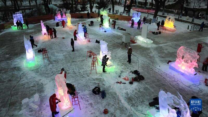 1月7日,冰雕师在哈尔滨冰灯艺术游园会园区参与全国专业冰雕比赛(无人机照片)。
