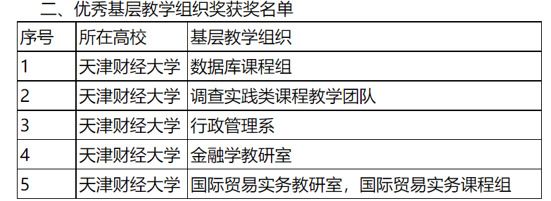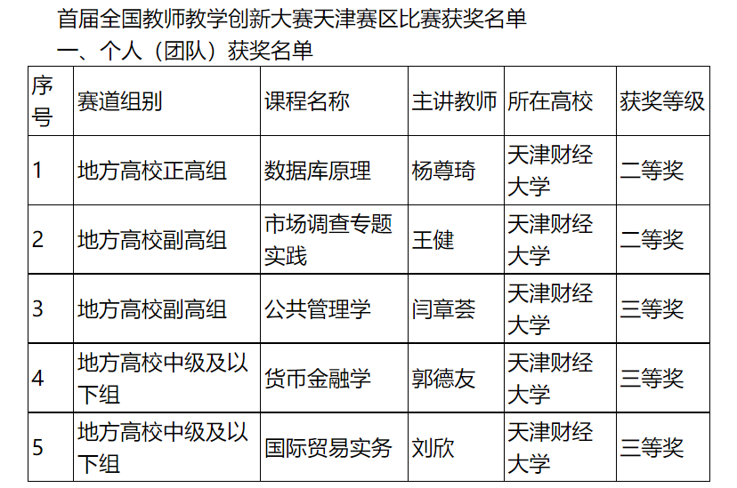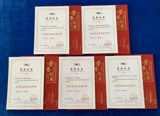 天津财经大学教师在决赛中过关斩将,杨尊琦老师获地方高校正高组二等奖;王健老师获地方高校副高组二等奖;闫章荟老师获地方高校副高组三等奖;郭德友老师、刘欣老师分获地方高校中级及以下组三等奖。数据库课程组、调查实践类课程教学团队、行政管理系、金融学教研室、国际贸易实务教研室(国际贸易实务课程组)五个基层教学组织获优秀基层教学组织奖。