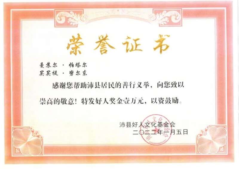 1月2日,一封来自江苏省沛县县委、县政府的感谢信送到新疆维吾尔自治区库尔勒市委、市政府,感谢热心的库尔勒市民曼苏尔·帕塔尔和买买提·努尔东,并从沛县“好人基金”中列支1万元奖金,奖励两人的善行。