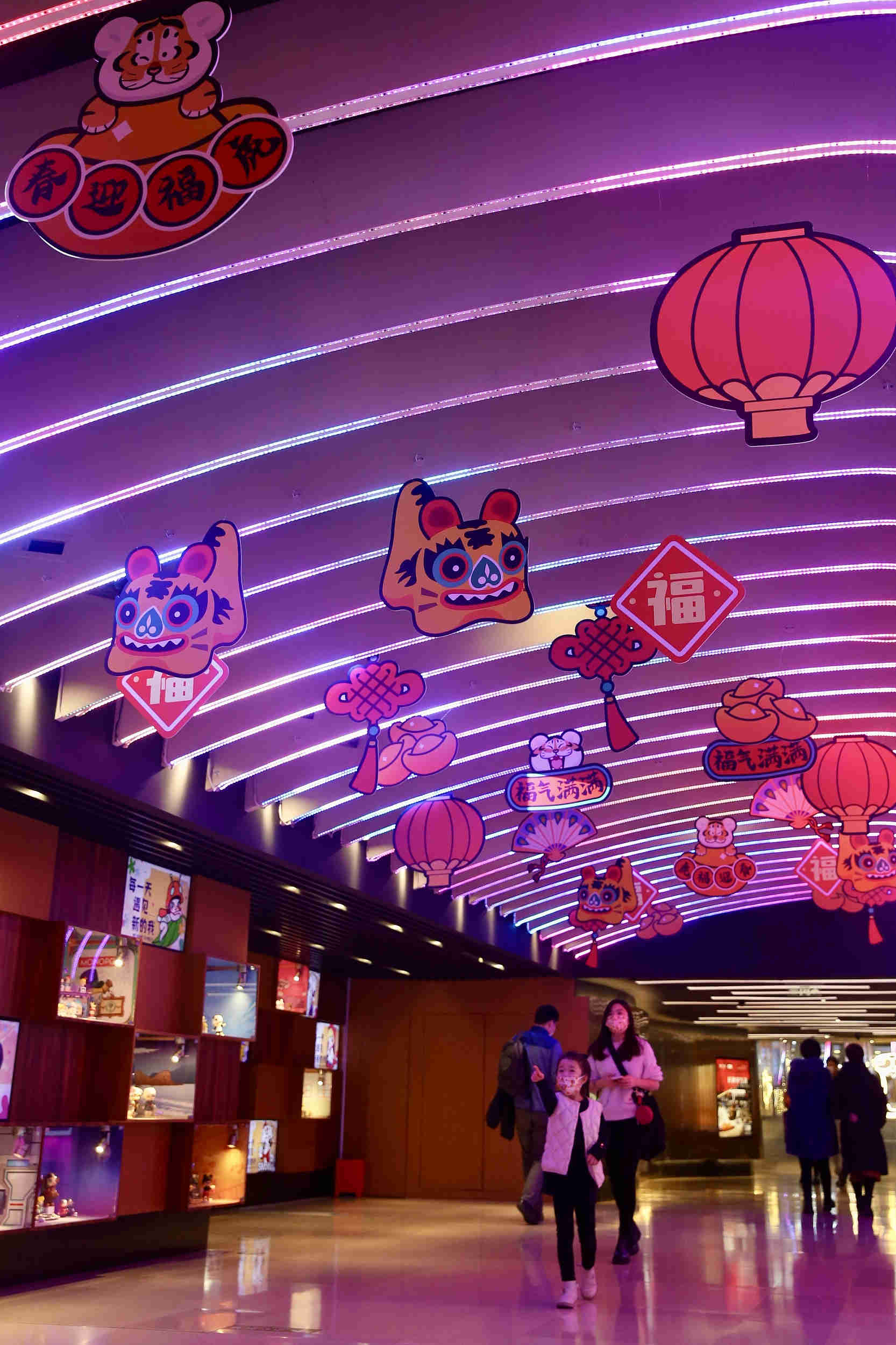 2022年1月9日,北京国贸商场,大人带着孩子走过带有虎年装饰的连廊。 中新社记者 易海菲 摄