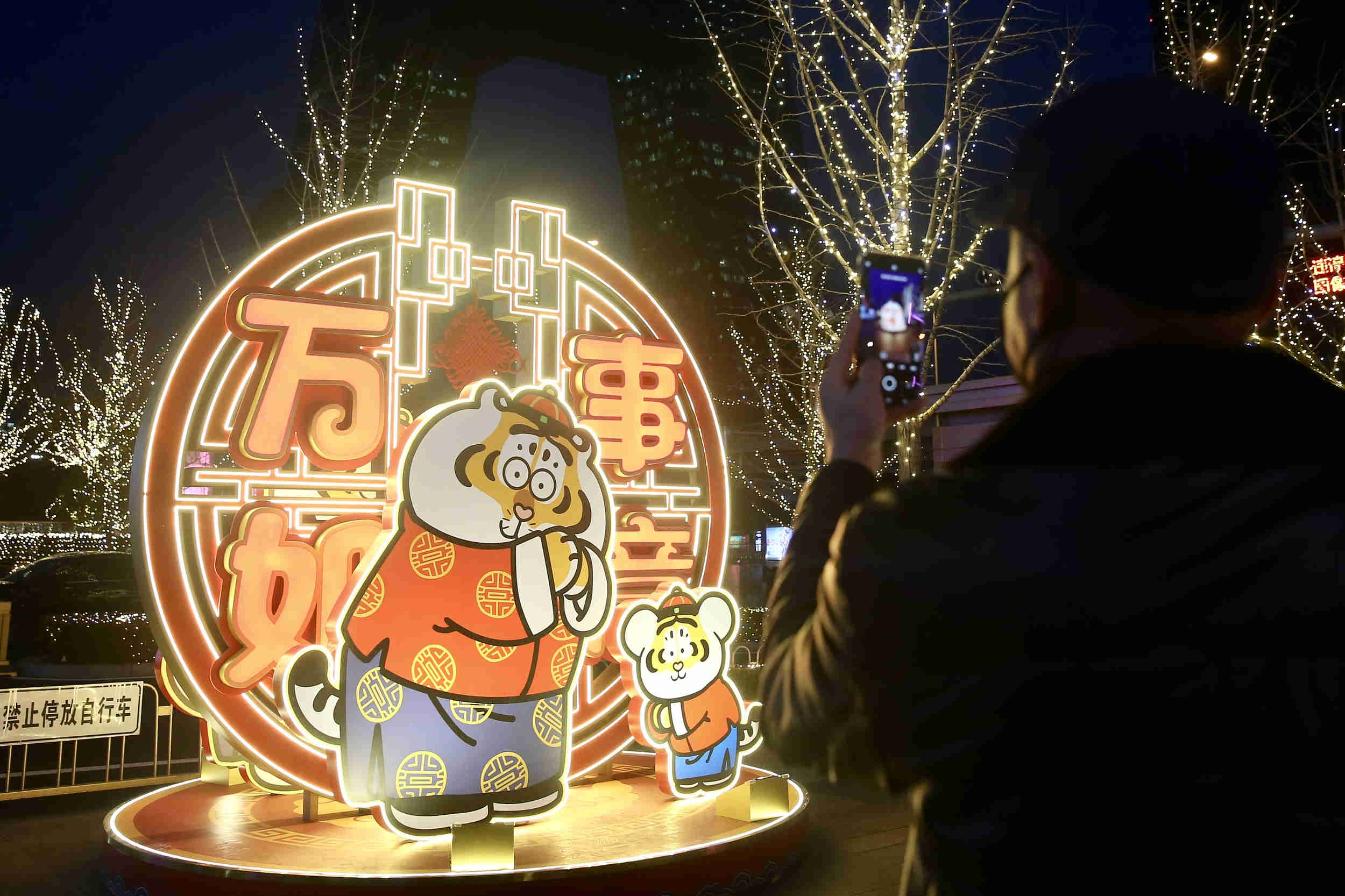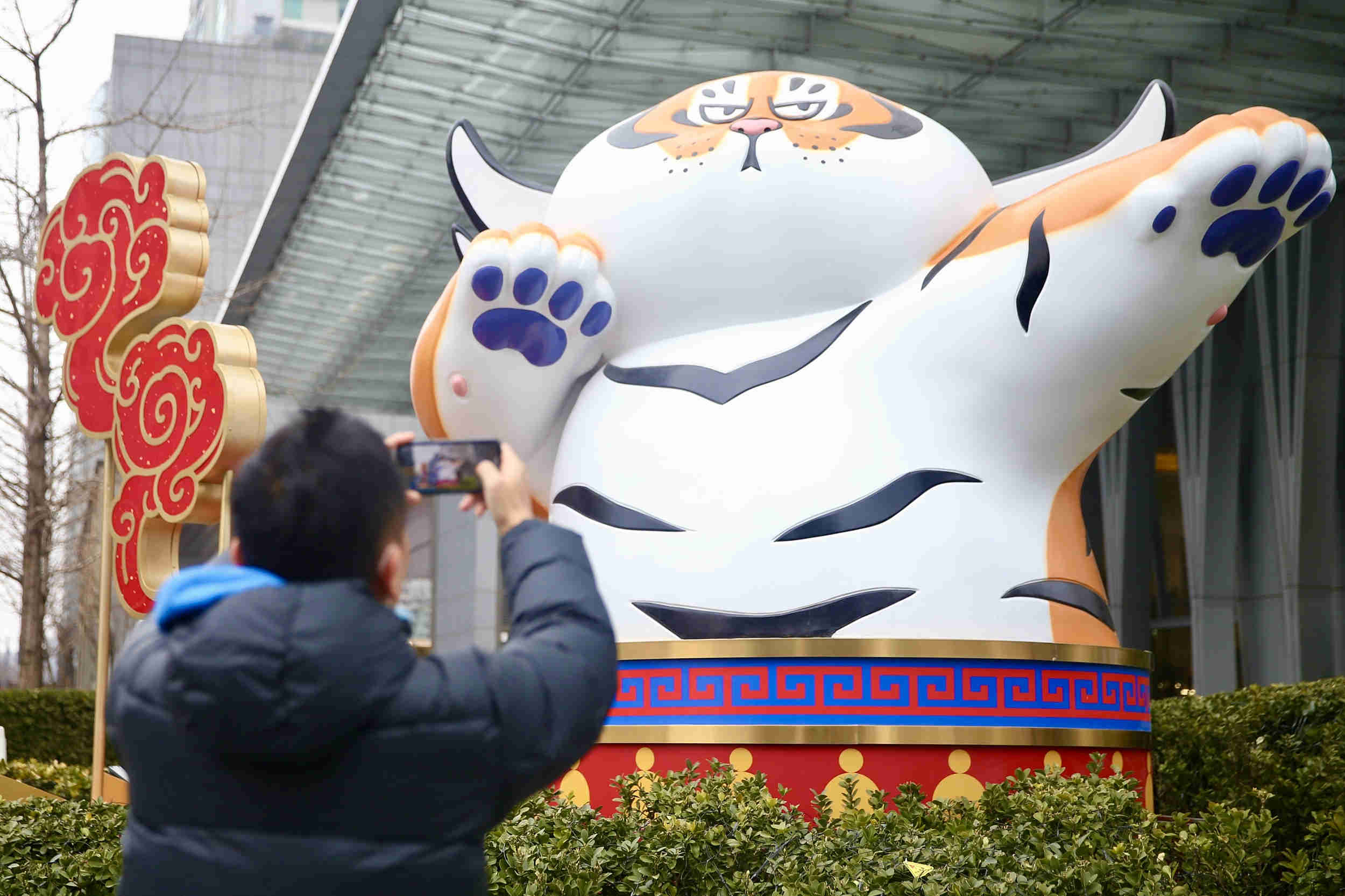 2022年1月9日,市民在北京街头拍摄布置的萌趣“胖虎”艺术装置。 中新社记者 易海菲 摄