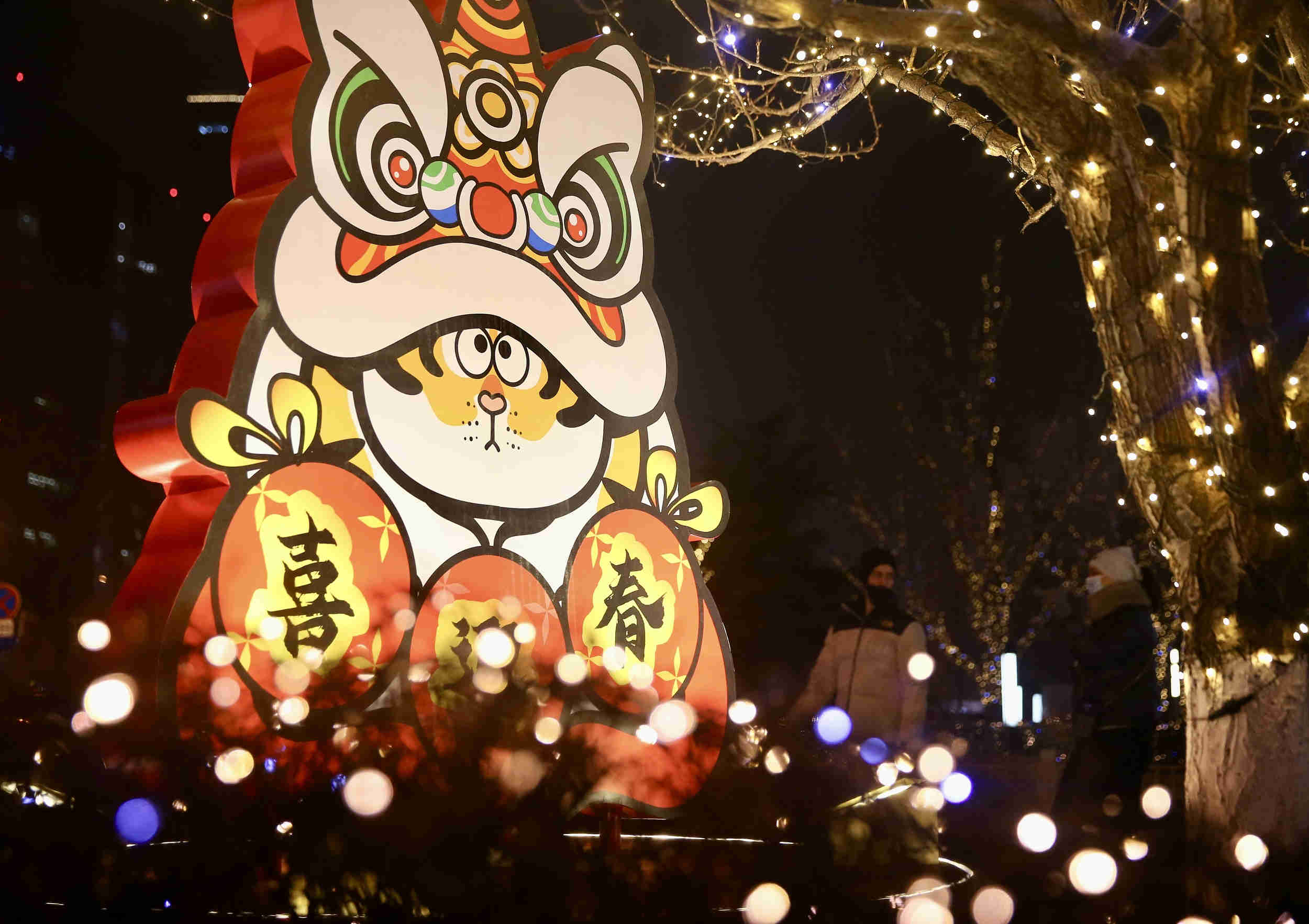 2022年1月9日,两名路人从北京国贸商场前的萌趣“胖虎”艺术装置前走过。 中新社记者 易海菲 摄