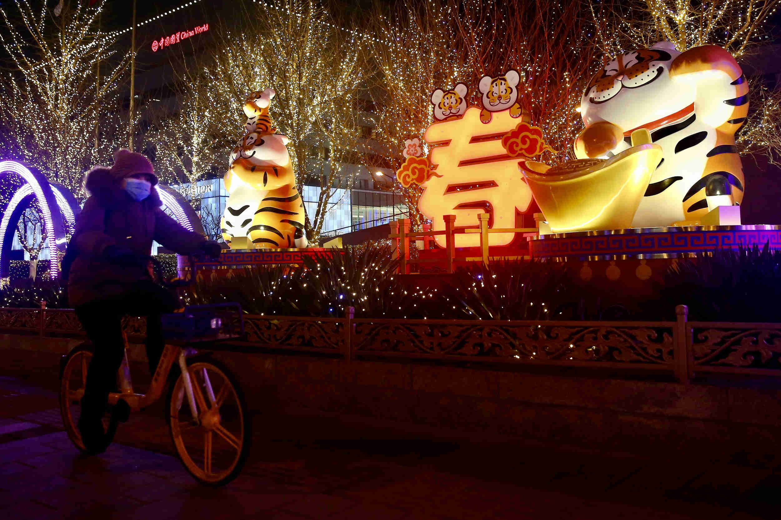 2022年1月9日,市民从北京国贸商场前的萌趣“胖虎”艺术装置前骑行而过。 中新社记者 易海菲 摄