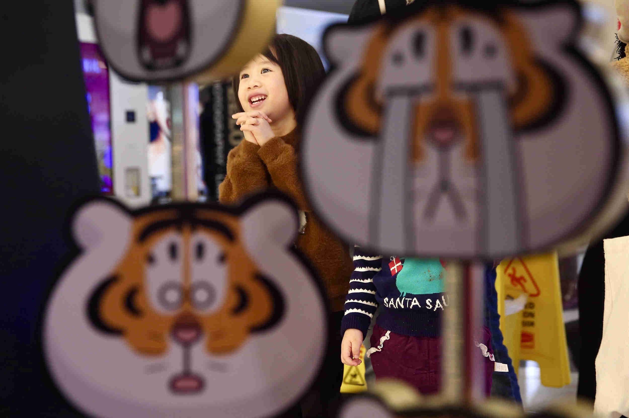 2022年1月9日,北京国贸商场,孩子正在观赏布置的萌趣“胖虎”艺术装置。 中新社记者 易海菲 摄