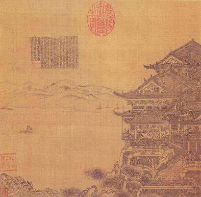但凡楼堂、宫室、馆阁、亭台等建筑完工,多有碑铭、题记、诗词或辞赋记载,后代的文人墨客赞颂或追思的作品也会流传下来。唐代诗人王勃的《滕王阁序》、杜牧的《阿房宫赋》、宋代政治家、诗人范仲淹的《岳阳楼记》、散文家欧阳修的《醉翁亭记》等,都是千古绝唱。 上右图为元代画中的滕王阁。