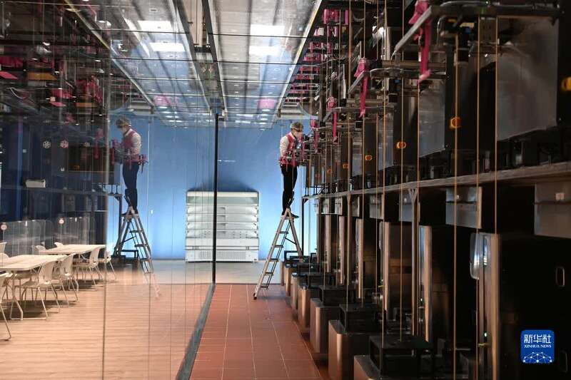 1月10日,一名工作人员在主媒体中心媒体餐厅维护自动送餐设备。新华社记者 贺长山 摄