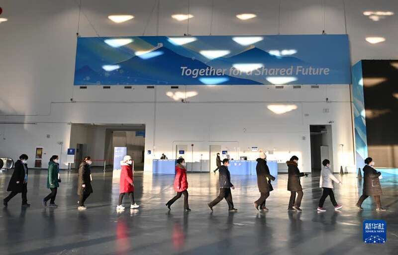 1月10日,工作人员有序进入北京冬奥会主媒体中心大厅,准备上岗。新华社记者 贺长山 摄