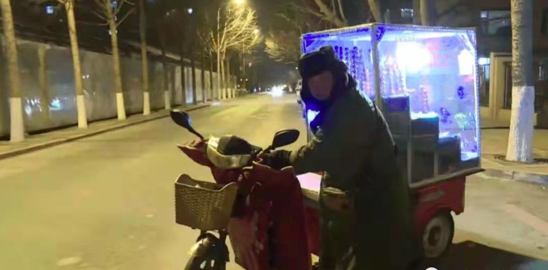 为了能随时照顾发病的女儿,李平富夫妻俩开始做糖葫芦。每天下午4点,李平富会推着三轮车在一个小区门口卖糖葫芦,为了抵抗零下一二十摄氏度的寒冬,他脚底贴着防寒贴,穿着好几层棉衣。