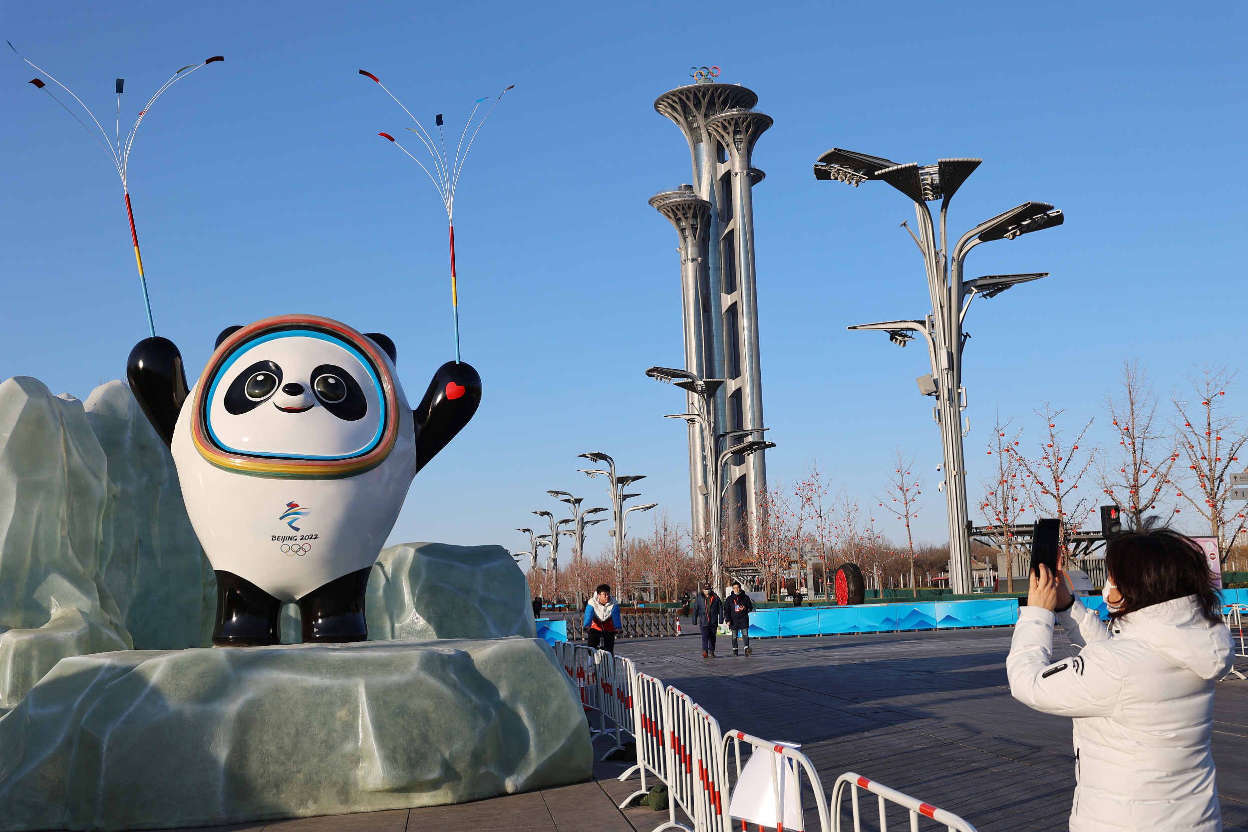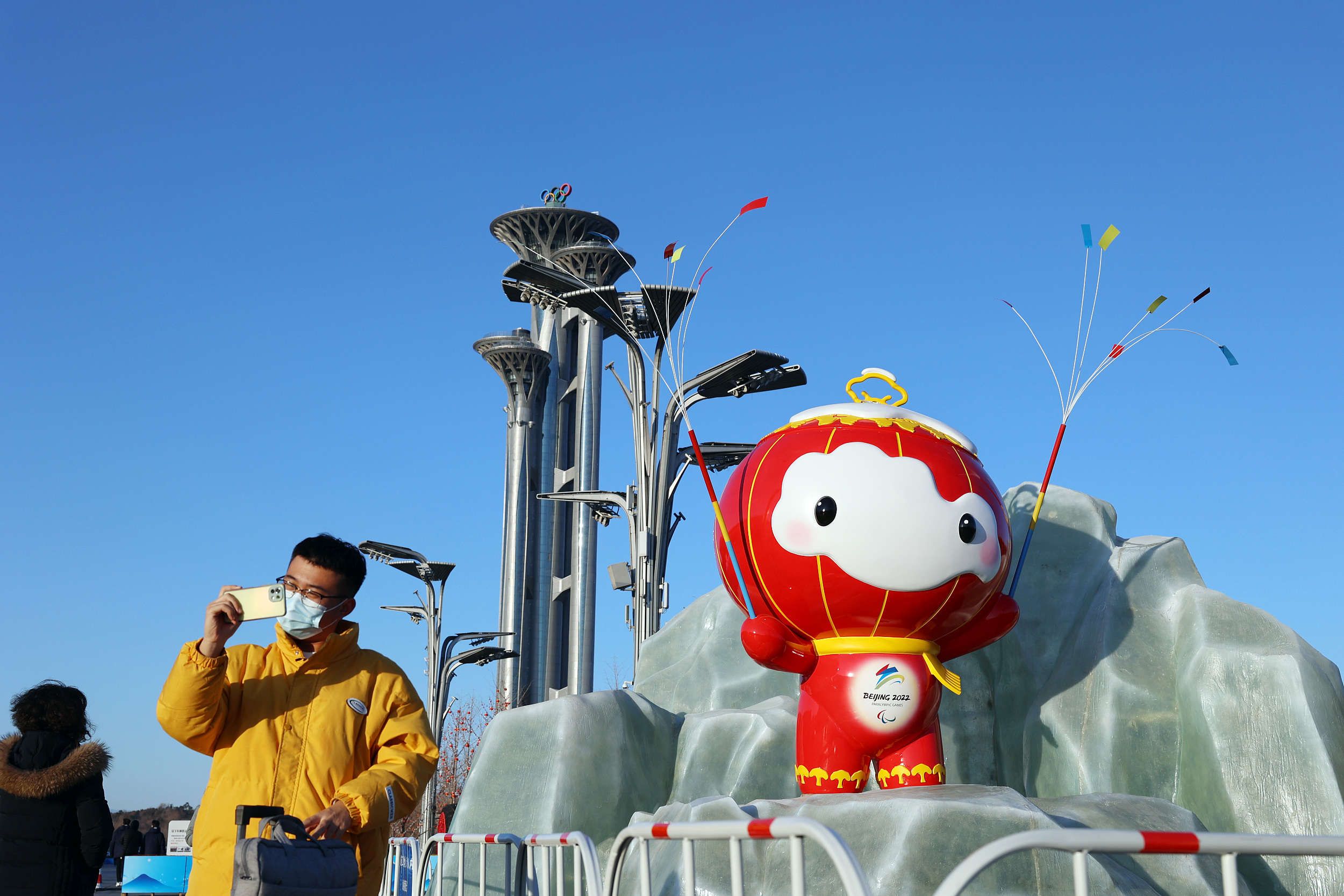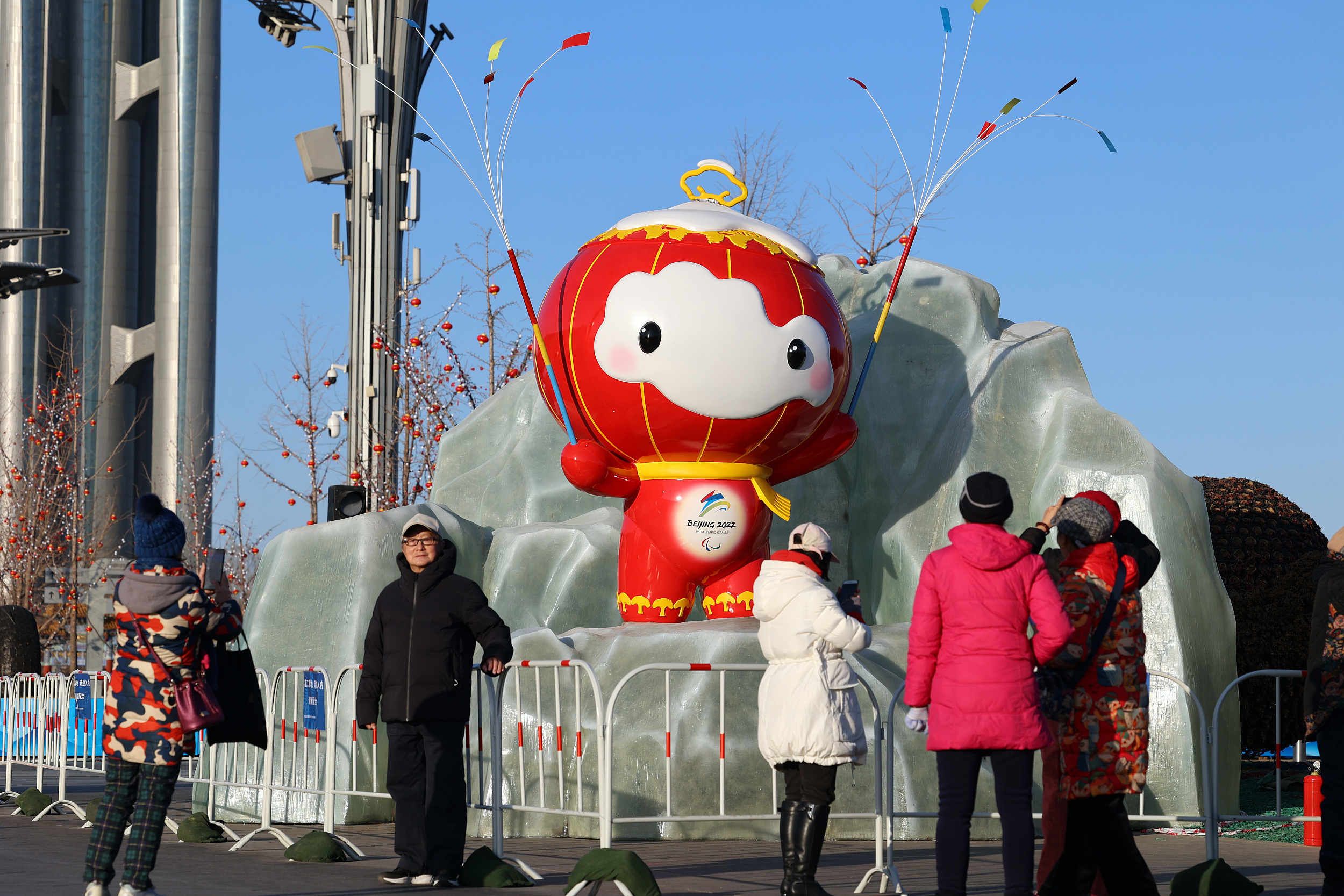 2022年1月10日,2022年北京冬奥会吉祥物“冰墩墩”和冬残奥会吉祥物“雪容融”最新造型亮相奥林匹克公园,吸引众多游人合影留念。