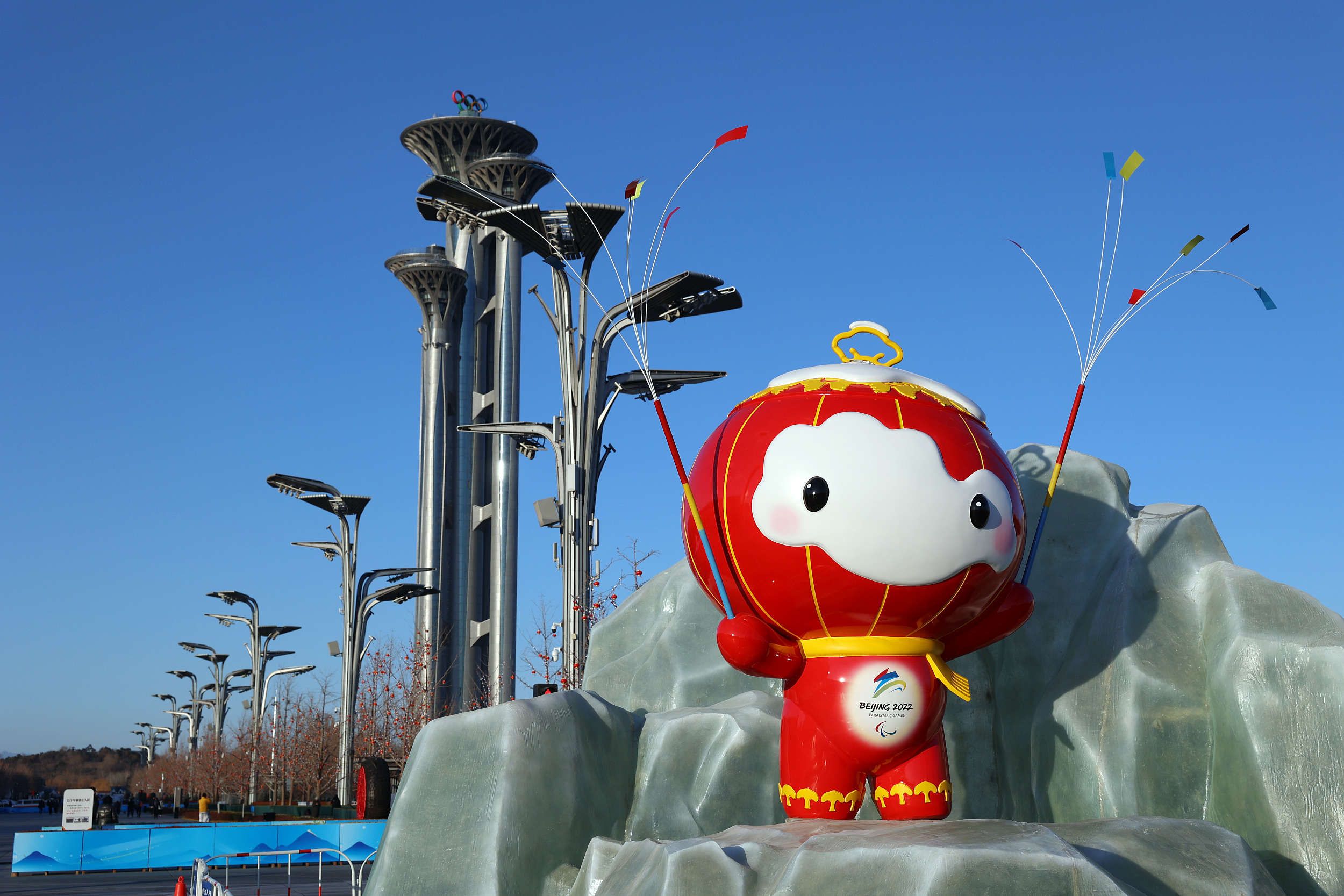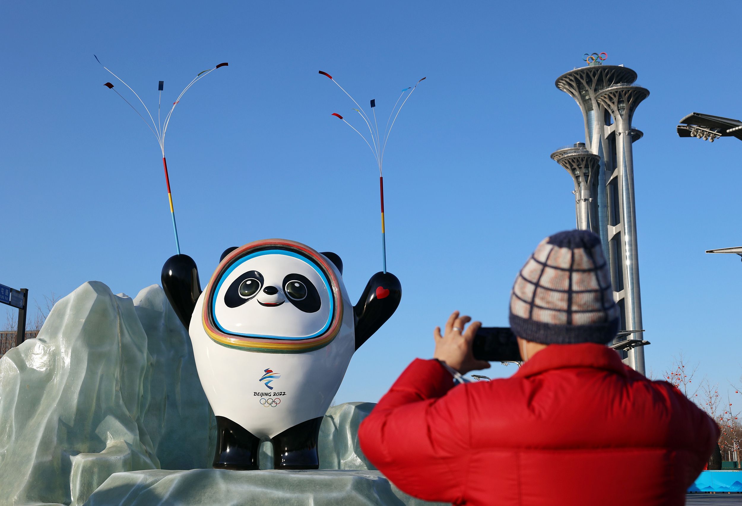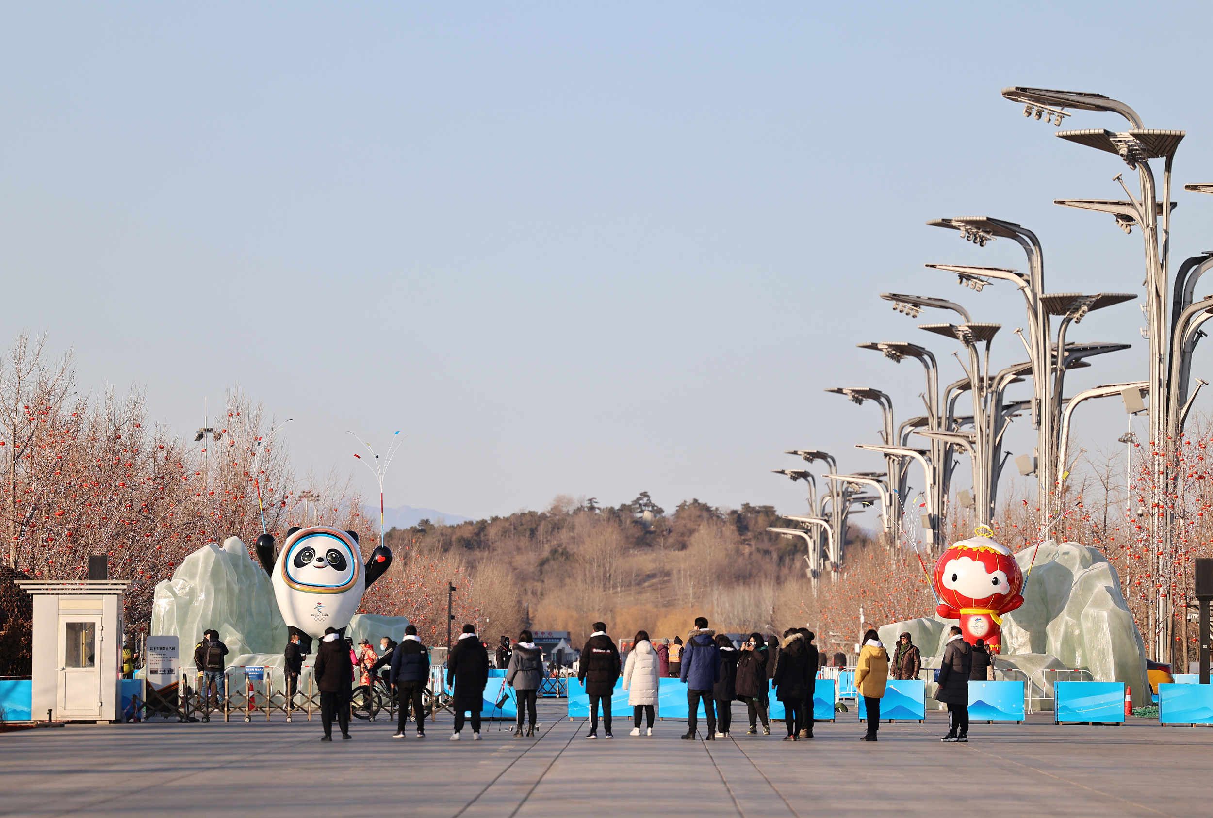 2022年1月10日,2022年北京冬奥会吉祥物“冰墩墩”和冬残奥会吉祥物“雪容融”最新造型亮相奥林匹克公园,吸引众多游人合影留念。