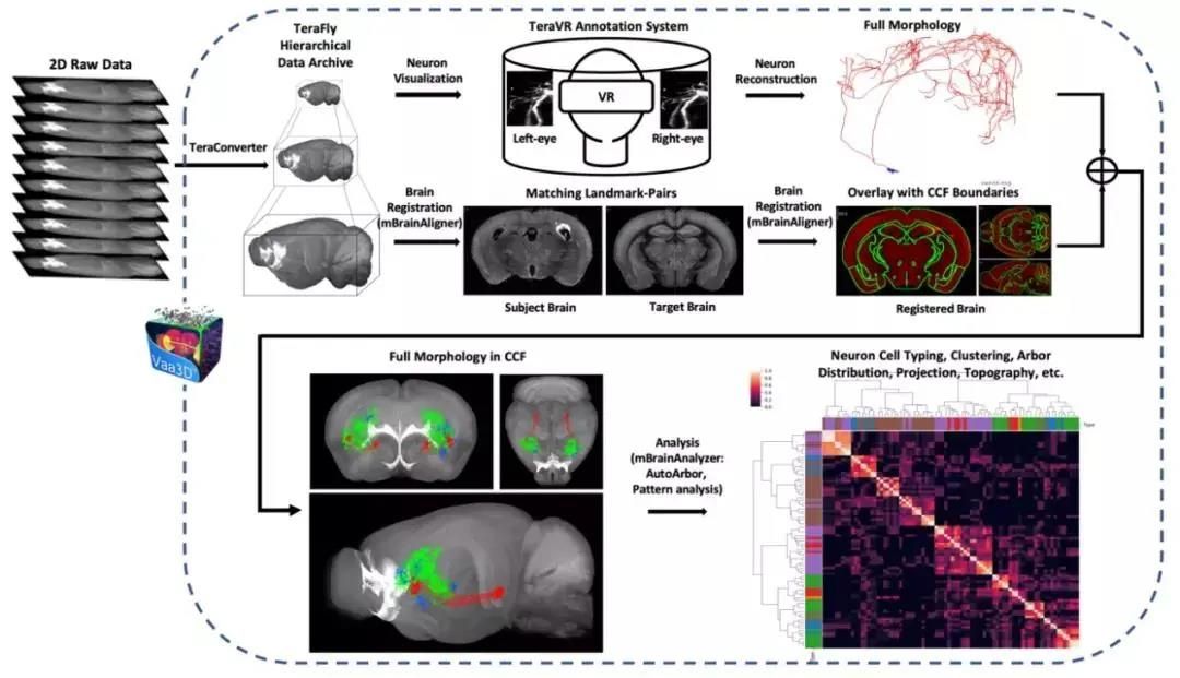 研究团队在将脑内神经元选择性稀疏标记后通过fMOST成像系统获得全脑图像,运用自主研发的开源、跨平台的三维可视化、重建和分析系统——Vaa3D系统以及大数据智能管理平台建立标准化图像数据处理和重建工作流程,同时建立严格的质量控制过程,以确保重建形态的完整性;Vaa3D 系统融合了团队开发的一系列自动重建算法,整合了可“沉浸式”观察、重建神经元的TeraVR(Nature Communication, 2019)以及其他不断迭代的重建工具箱;大数据智能管理平台实现了多维大数据的有序安全存储以及多人同时协作、多层级数据的本地和远端的调用。平台开发了跨模态配准管线-mBrainAligner算法(Nature Methods, 2021),将数据集配准到Allen公共坐标框架图谱 (CCFv3)中。