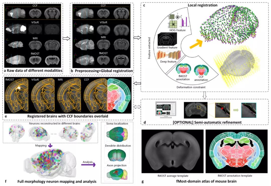 mBrainAligner用于跨模态图像配准、大脑轮廓绘制、全脑完整形态神经元重建数据映射、fMOST鼠脑图谱建立的总体流程