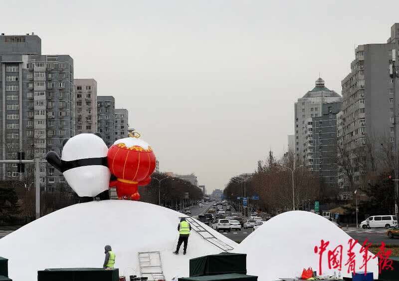 1月12日,位于北京中轴线北延长线的北辰路,施工人员对北京冬奥会吉祥物“冰墩墩”“雪容融”的雕塑进行最后的修饰。中青报·中青网记者 陈剑/摄
