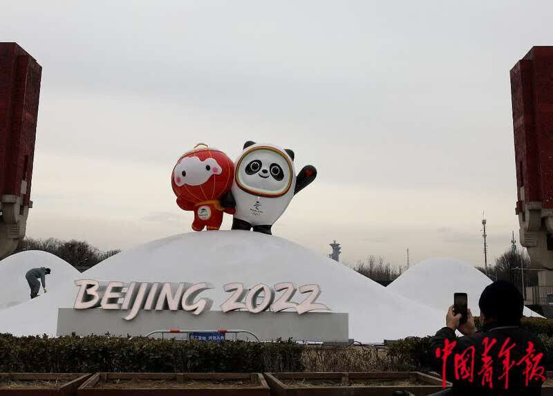 1月12日,位于北京中轴线北延长线的北辰路,北京冬奥会吉祥物“冰墩墩”“雪容融”的雕塑前,市民用手机拍照。中青报·中青网记者 陈剑/摄