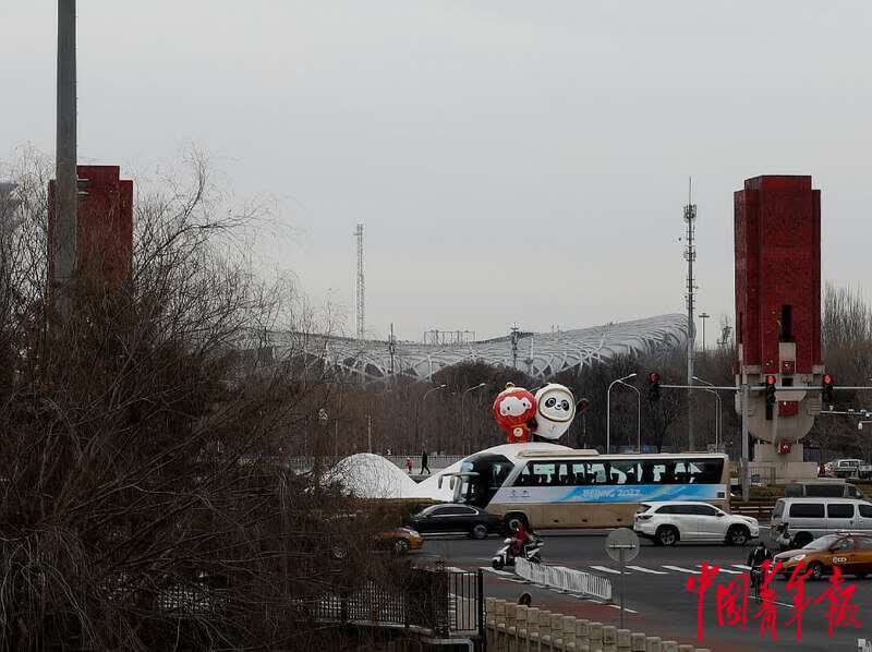 1月12日,位于北京中轴线北延长线的北辰路,北京冬奥会吉祥物“冰墩墩”“雪容融”的雕塑前车水马龙,一辆北京冬奥会会务大巴从路面经过。北京冬奥会临近,各项准备工作就绪,北京街头的“冬奥氛围”日渐浓郁。中青报·中青网记者 陈剑/摄