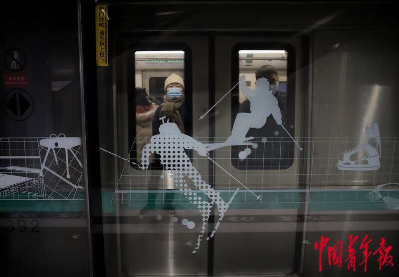 1月12日,号称“北京地下中轴线”的地铁8号线奥体中心站,地铁的屏蔽门上贴上了冰雪运动的图案。中青报·中青网记者 陈剑/摄