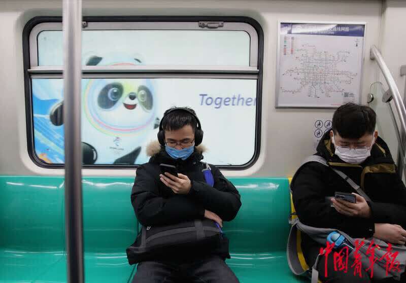 1月12日,号称北京地下中轴线的地铁8号线,一块“冰墩墩”的广告牌从地铁车厢外闪过。中青报·中青网记者 陈剑/摄