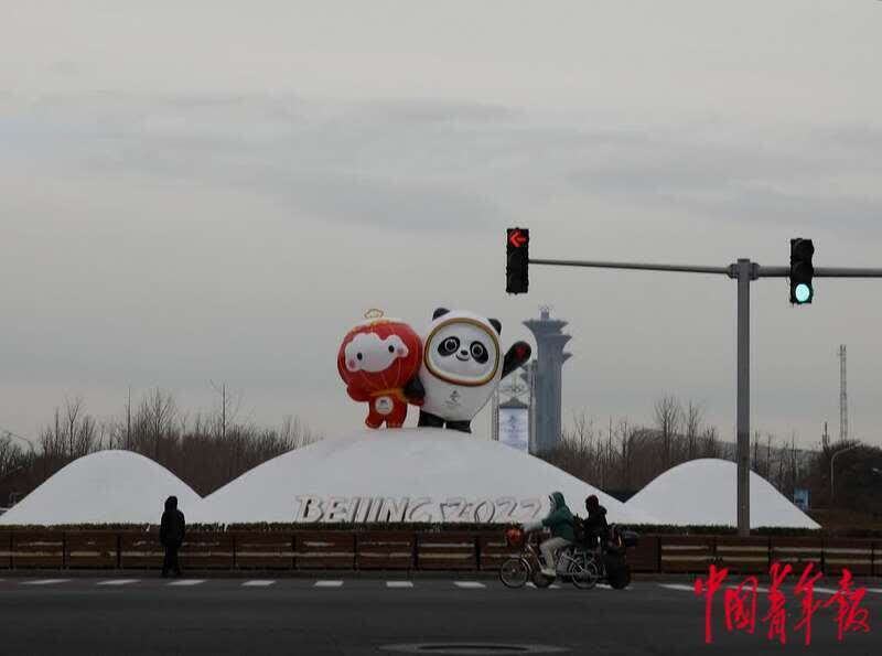 1月12日,位于北京中轴线北延长线的北辰路,市民骑车从北京冬奥会吉祥物“冰墩墩”“雪容融”的雕塑前经过。中青报·中青网记者 陈剑/摄
