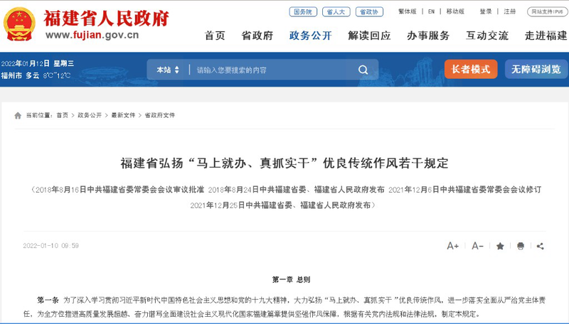 上述规定指出,“‘马上就办、真抓实干’是习近平总书记在福建工作期间亲自倡导和践行的优良作风,是福建人民的宝贵精神财富,集中体现了不忘初心、为民服务的公仆情怀,血肉相连、情同鱼水的群众观点,锐意进取、攻坚克难的实干精神,时不我待、永不懈怠的责任担当。全省各级各部门应当大力弘扬这一优良传统作风,使‘马上就办、真抓实干’成为新时代广大党员、干部的自觉行动。”