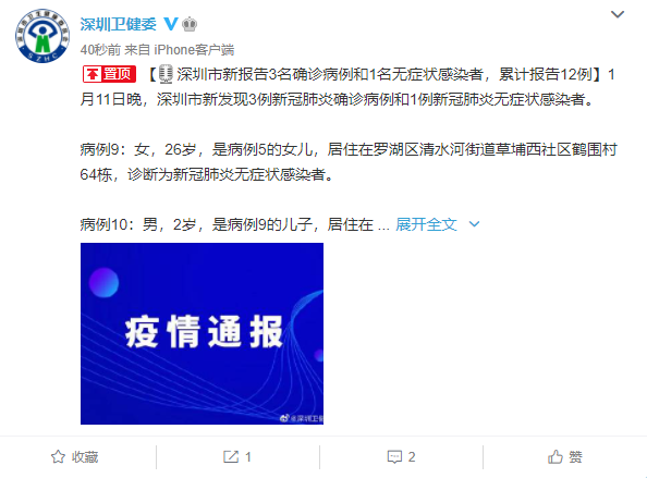 【深圳市新报告3名确诊病例和1名无症状感染者,累计报告12例】1月11日晚,深圳市新发现3例新冠肺炎确诊病例和1例新冠肺炎无症状感染者。