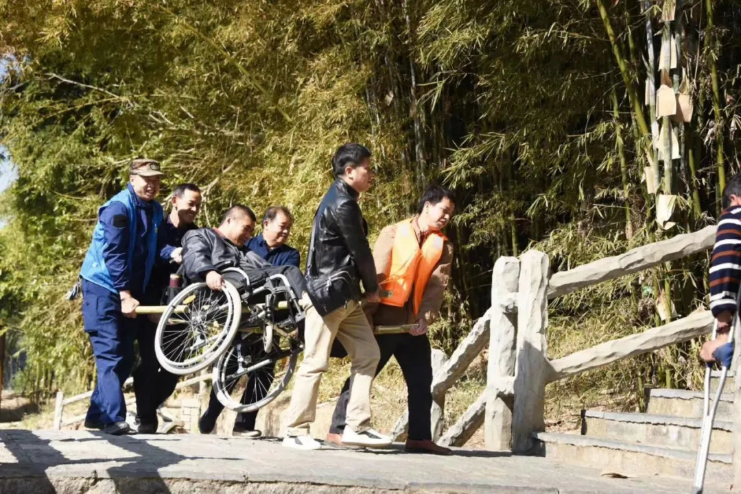 九寨沟景区当时无障碍出行通道并不完善,坐在轮椅上的残障人士上山,需要工作人员和志愿者一个个背、抱、抬式的帮助。好在他们得到很多旅行社同行积极支持,有好多从省外过来帮忙。
