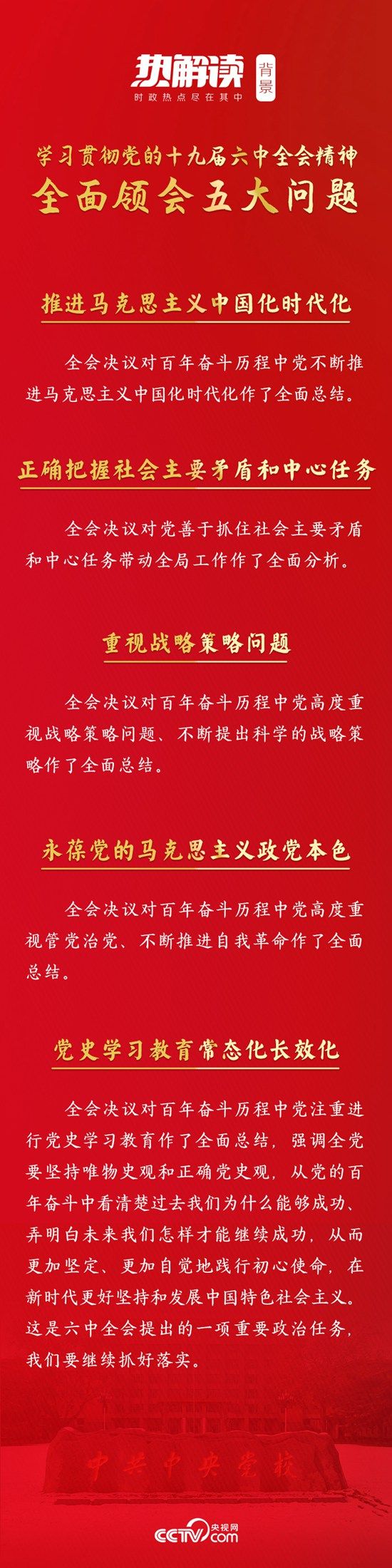 围绕“学习贯彻党的十九届六中全会精神”这个主题,总书记深入阐述了五大重要问题。首要问题便是推进马克思主义中国化时代化。
