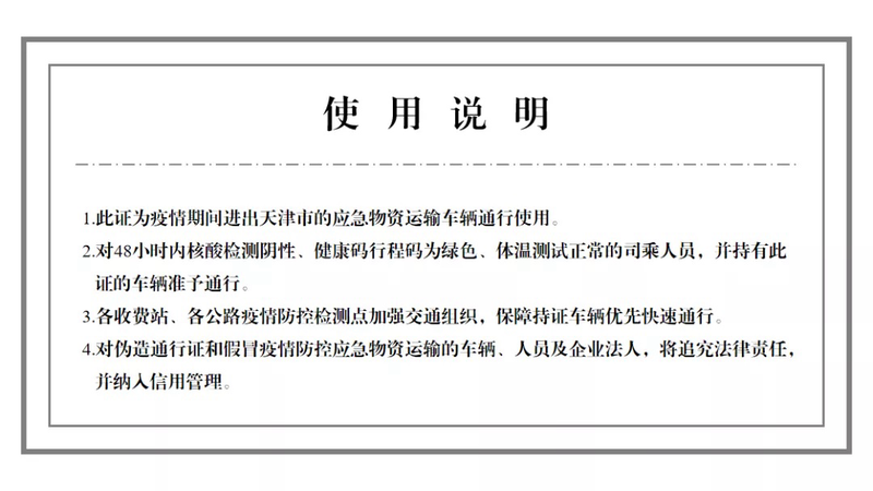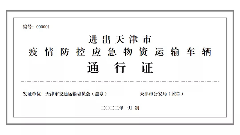 天津市交通专班要会同发展改革、工业和信息化、商务、农业农村等部门建立完善应急物资(包括医疗防控物资、鲜活农产品、重点生产生活物资、能源物资、邮政快递等各类重点物资)运输车辆通行证管理制度,向社会公布《进出天津市疫情防控应急物资运输车辆通行证》(以下简称《通行证》,式样见附件)办理条件及办理程序。疫情期间对于来自天津市的应急物资运输车辆,各地公路疫情防控检查站点在司乘人员体温检测正常、持有48小时内核酸检测阴性证明、健康码和行程码为绿色、并持有《通行证》的条件下,保障顺畅通行。要依托高速公路服务区、“司机之家”等场所增设流动核酸检测点,为货车司机等应急物资运输保障人员开展核酸检测提供便利。要指导集卡运输企业做好运力储备,畅通集装箱运输通道,减少交通拥堵,并充分发挥铁路运输优势,切实保障天津港集疏运通畅;要指导货车司机严格做好个人防护和健康监测,减少中途停留和人员接触,在具备条件的线路推动实施固定人员、固定车辆的闭环管理。